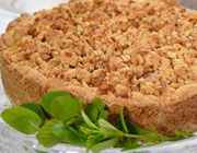 3 – Unte uma fôrma de fundo removível e forre o fundo e as laterais com a massa. Forre bem. Arrume o recheio dentro e cubra tudo com a massa misturada às nozes. Agora leve ao forno preaquecido, forno médio, por 40 minutos. Espere esfriar um pouco e desenforme. Sirva em seguida ou leve para a geladeira.
